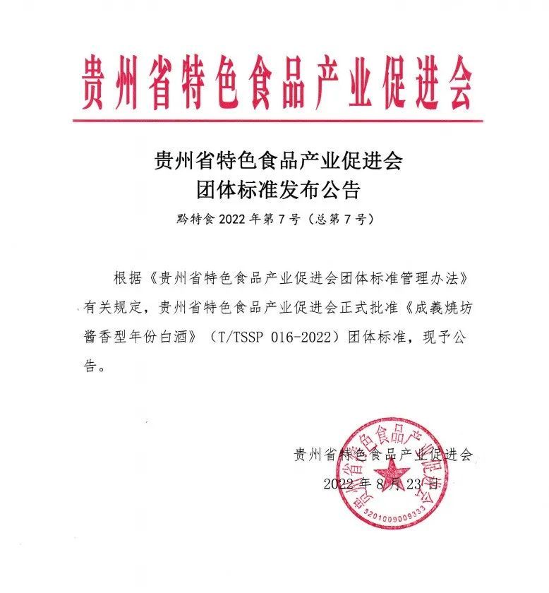 《成義燒坊醬香型年(nián)份白(bái)酒》團體(tǐ)标準于2022年(nián)8月25日(rì)發布,定于2022年(nián)9月1日(rì)起正式實施。該标準實施以後,貴州省特色食品産業促進會各會員(yuán)單位可(kě)申請(qǐng)執行。