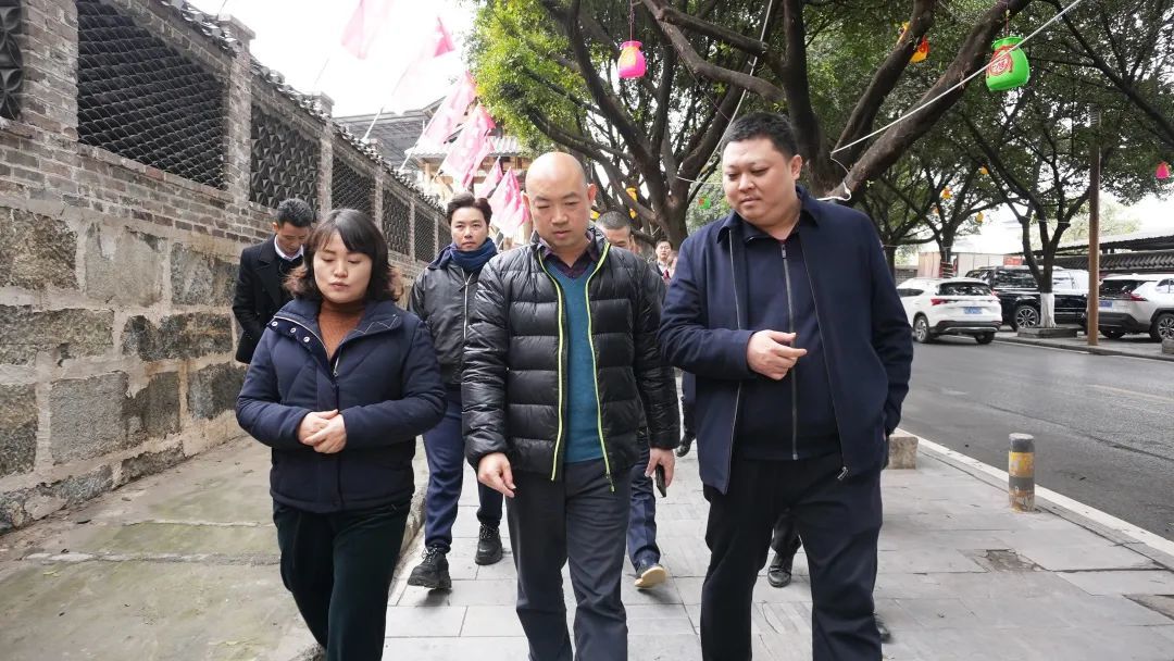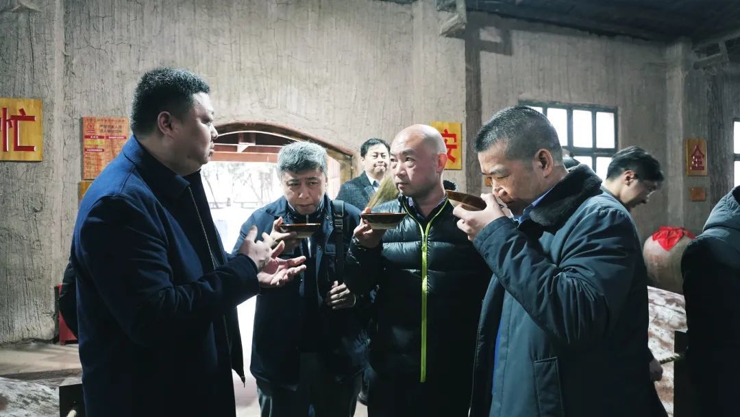 貴州省委統戰部三處(港澳台海外處)處長孔祥龍(左二)、遵義市文化旅遊局、遵義市文物局副局長黃(huáng)琨(右一)、仁懷市文化旅遊局局長張啟霞(左一)考察成義老燒坊酒莊